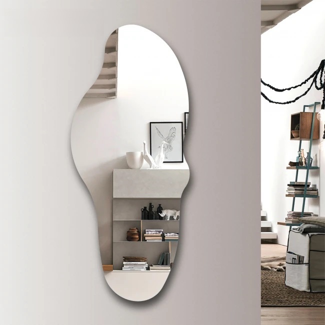 An exclusive, modern, irregularly shaped mirror with a black frame. The mirror is moisture resistant, suitable for the bathroom.