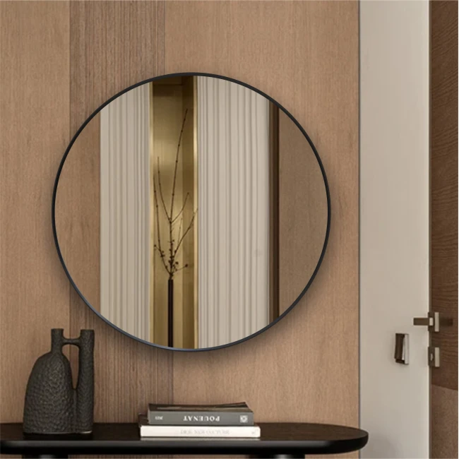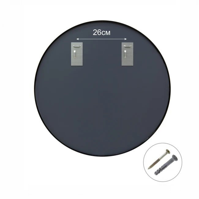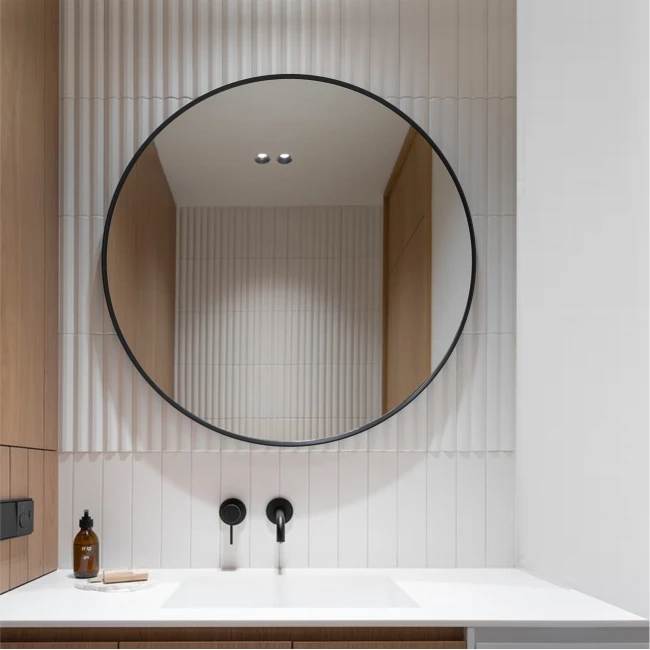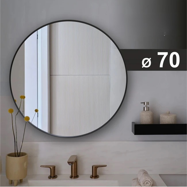 Minimalistinis pakabinamas apvalus veidrodis su juodu rėmu. Veidrodis yra atsparus drėgmei, tinka vonios kambariui. Dažniausiai kabinamas vonios kambariuose su siauromis kriauklėmis, kurioms reikalingas nedidelis plotis.