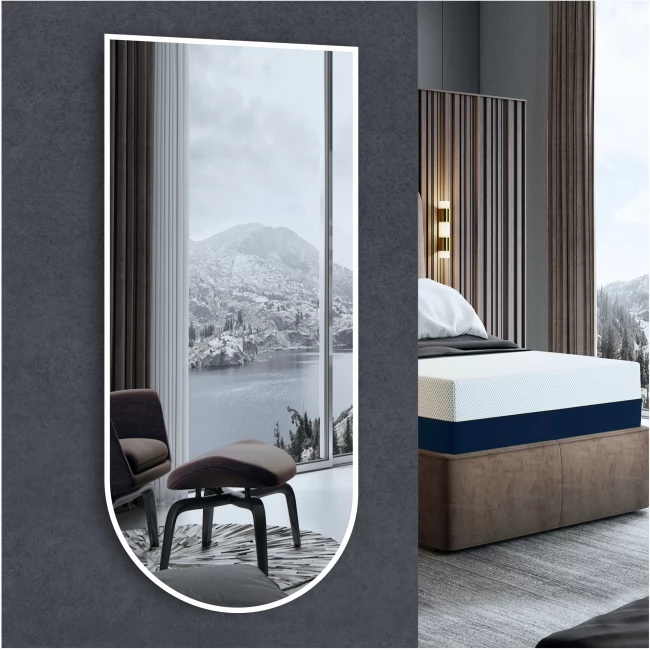 Minimalistinis pakabinamas arkos formos veidrodis su baltu rėmu. Veidrodis yra atsparus drėgmei, tinka vonios kambariui. Dažniausiai kabinamas vonios kambariuose su siauromis kriauklėmis, kurioms reikalingas nedidelis plotis.