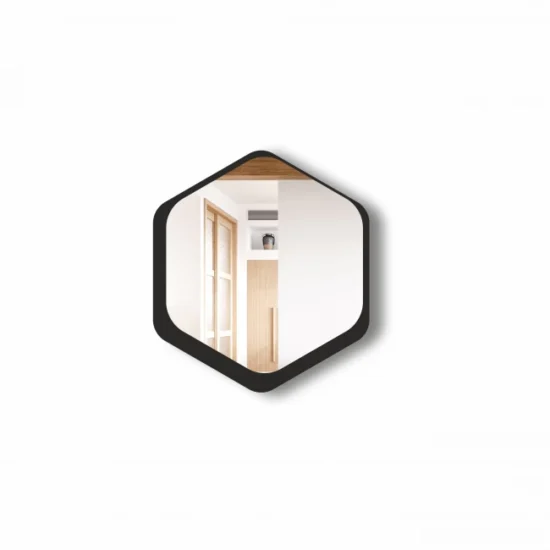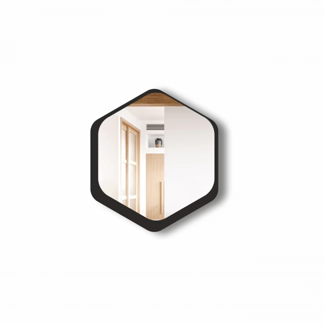 Išskirtinis, modernus, šešiakampis veidrodis su juodu rėmeliu . Veidrodis yra atsparus drėgmei tinka vonios kambariui.
