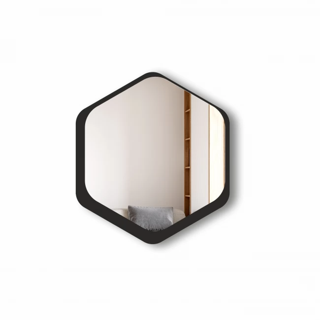 Išskirtinis, modernus, šešiakampis veidrodis su juodu rėmeliu . Veidrodis yra atsparus drėgmei tinka vonios kambariui.