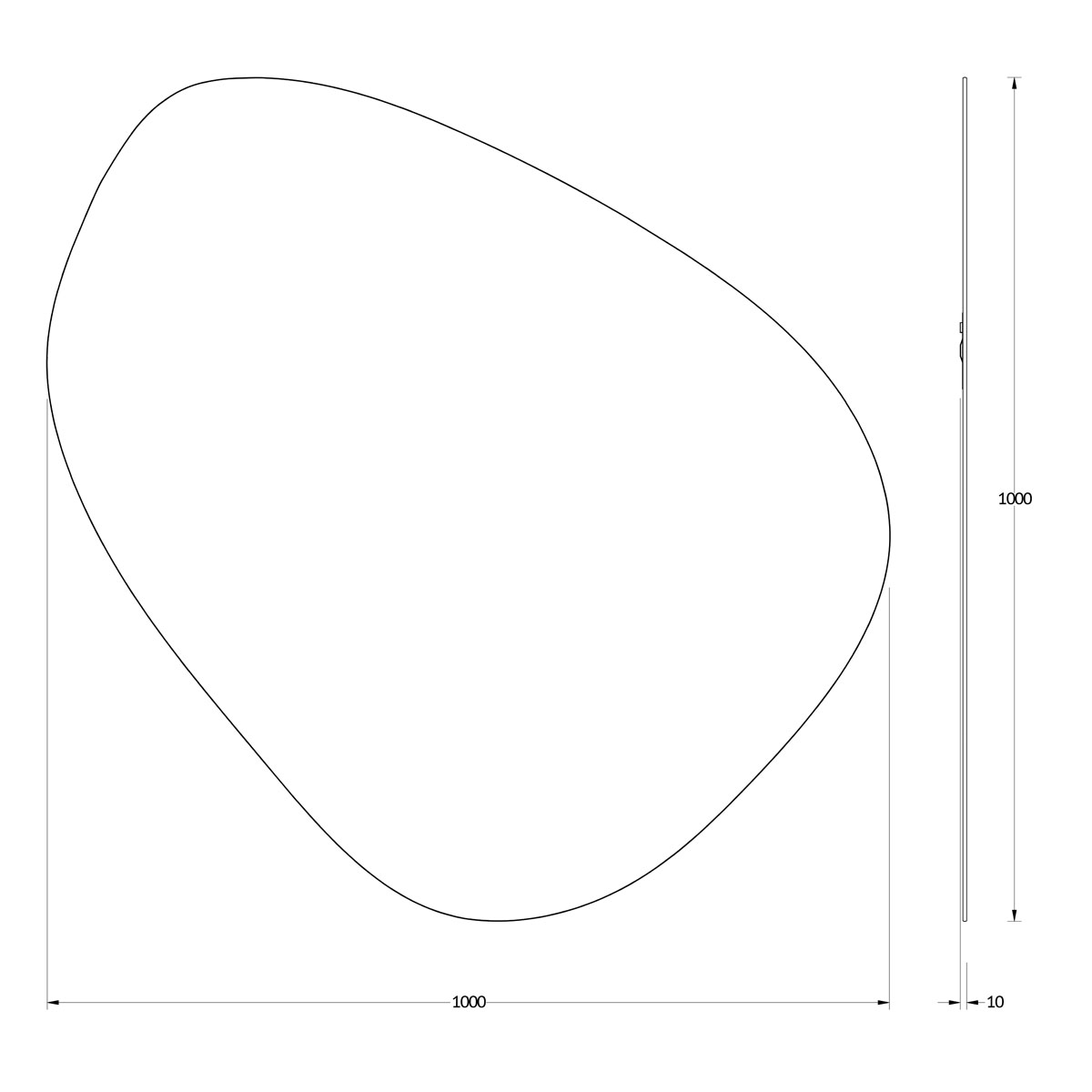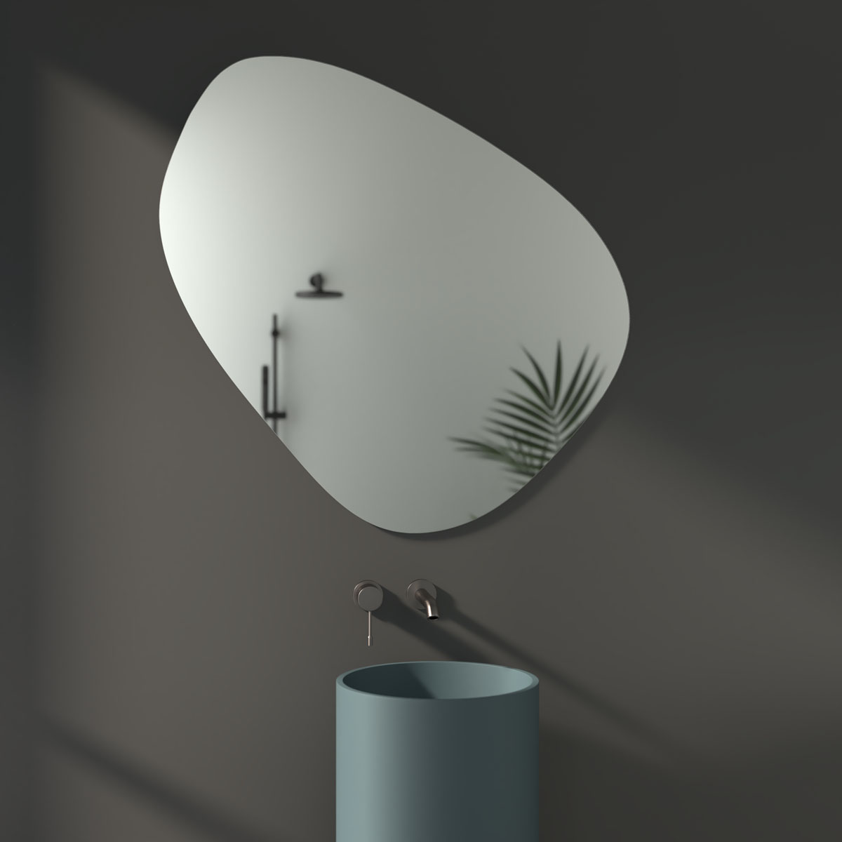 Išskirtinis, modernus, netaisyklingos formos veidrodis . Veidrodis yra atsparus drėgmei tinka vonios kambariui.
