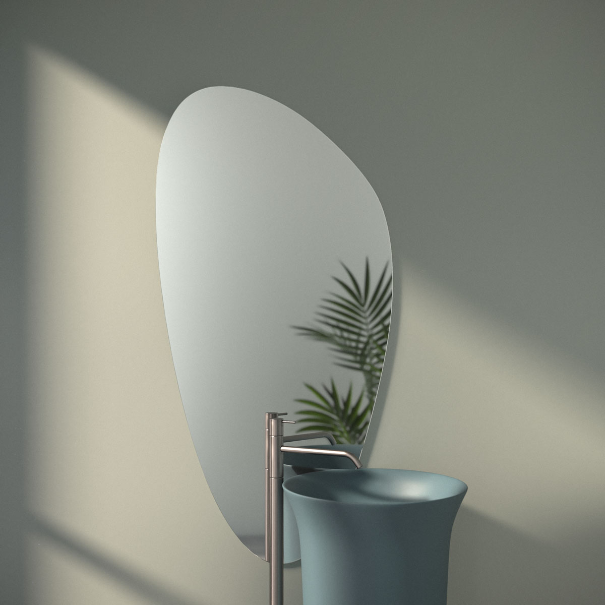 Išskirtinis, modernus, netaisyklingos formos veidrodis . Veidrodis yra atsparus drėgmei tinka vonios kambariui.