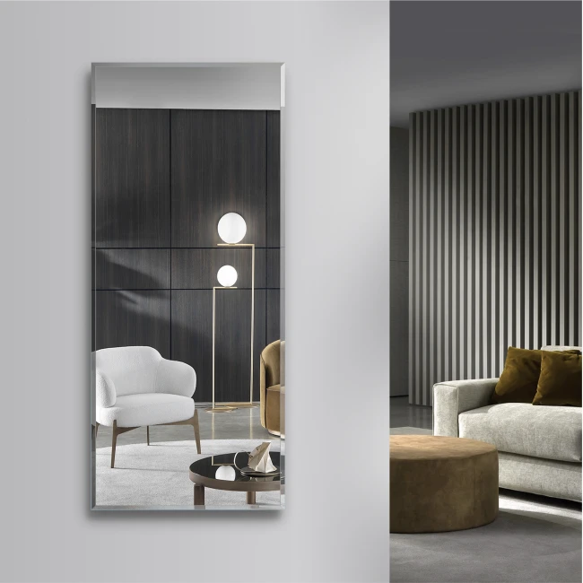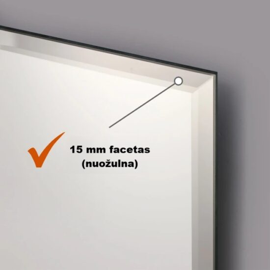 Veidrodis be rėmo, kurio visos kraštinės su 15 mm nuimta nuožulna (facetu). Veidrodis tinka vonios kambariui. Naudoti tik patalpose.