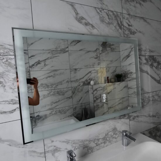 Stilingas veidrodis su integruotu LED apšvietimu ir dekoruotas matine juosta. Veidrodžio apšvietimo linija eina per visą perimetrą. Veidrodis yra atsparus drėgmei tinka vonios kambariui