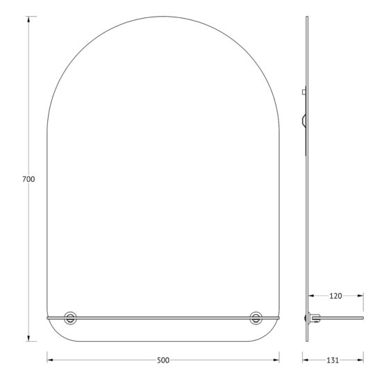 Gražus sieninis veidrodis su lentynėle. Veidrodžio viršus užapvalintas. Veidrodis yra atsparus drėgmei, skirtas vonios kambariui. Veidrodis komplektuojamas su pakabinimo elementais ir matinio stiklo lentynėle.