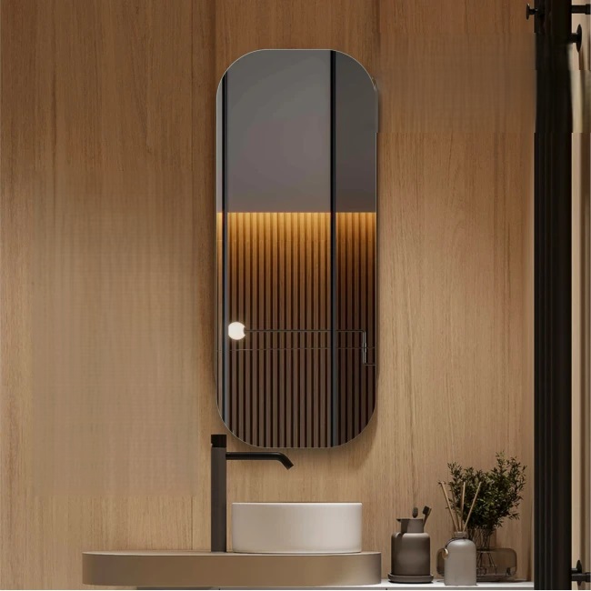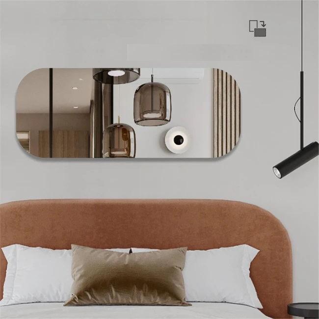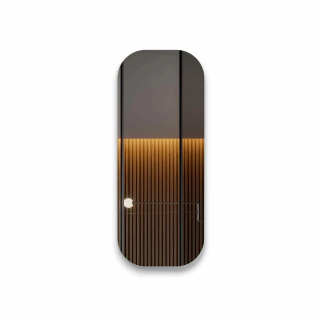 Gražus, modernus, pakabinamas veidrodis be rėmo. Veidrodis yra atsparus drėgmei tinka vonios kambariui.