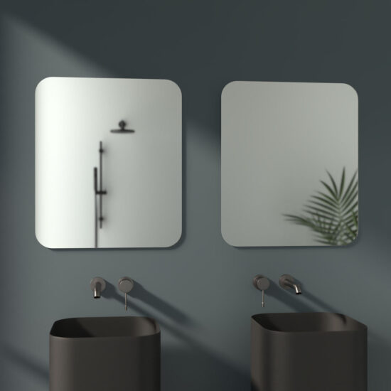 Gražus, modernus pakabinamas veidrodis be rėmo. Veidrodis yra atsparus drėgmei tinka vonios kambariui.