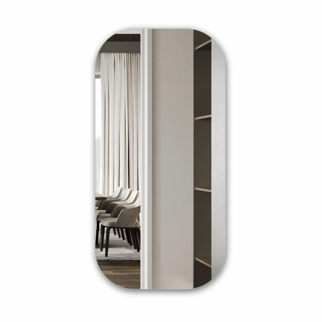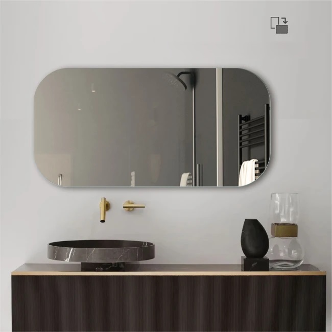 Gražus, modernus, pakabinamas veidrodis be rėmo. Veidrodis yra atsparus drėgmei tinka vonios kambariui.