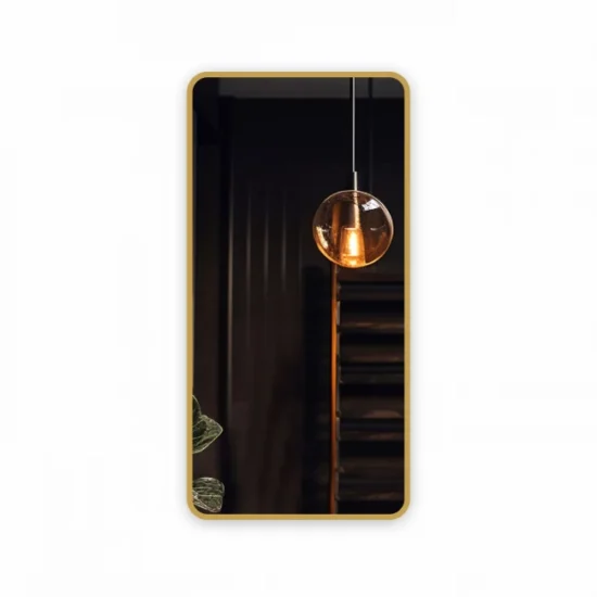 Modernus veidrodis užapvalintais kampais ir auksos spalvos rėmeliu