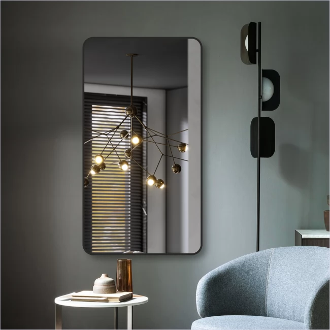 Modernus veidrodis užapvalintais kampais ir juodu rėmeliu